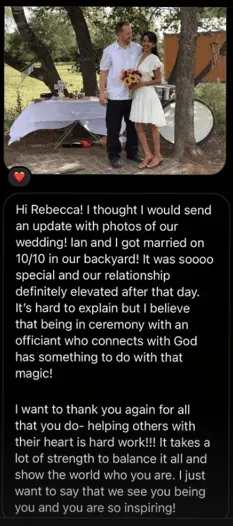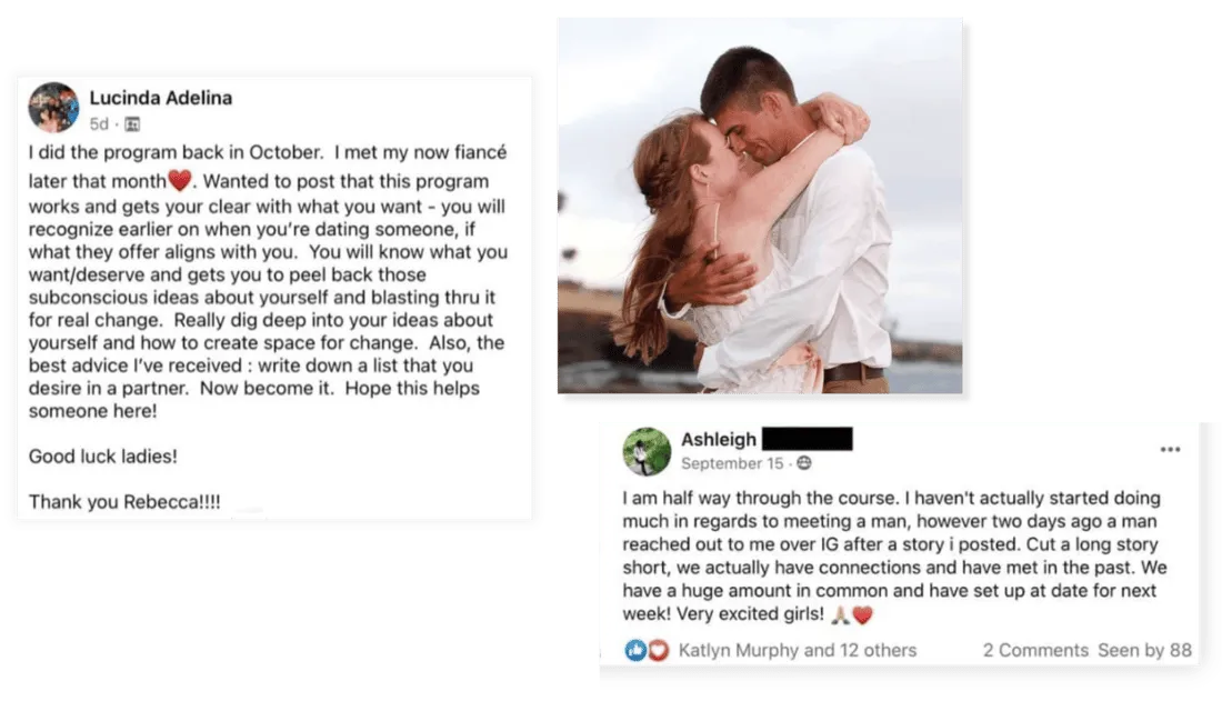 Rebecca’s teachings helped me create a relationship with the man of my dreams! He is handsome, thoughtful, funny, caring, playful, attentive, appreciative and generous. I feel loved, cherished, appreciated, valued and valuable. After working with her, I feel loved, happy, secure and confident! When Rebecca had me imagine the positive things I wanted for myself and my relationship, I quit projecting the negative I expected and became open to the positive possibilities that I wanted which brought me health, happiness, and joy! If you want to thrive and experience your hopes and heart’s desires, then I whole heartedly recommend Rebecca's coaching.”-Mary