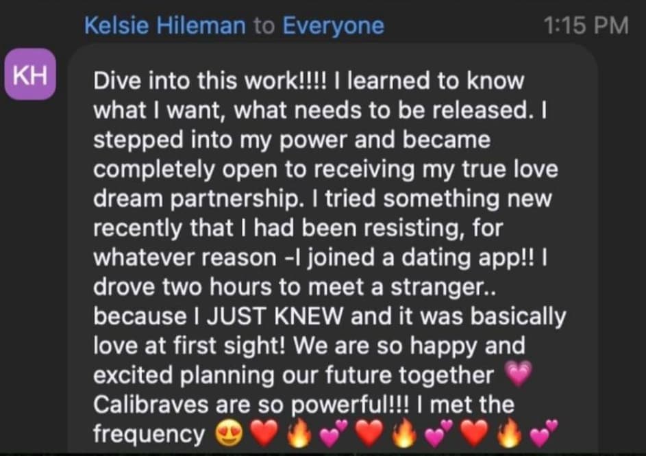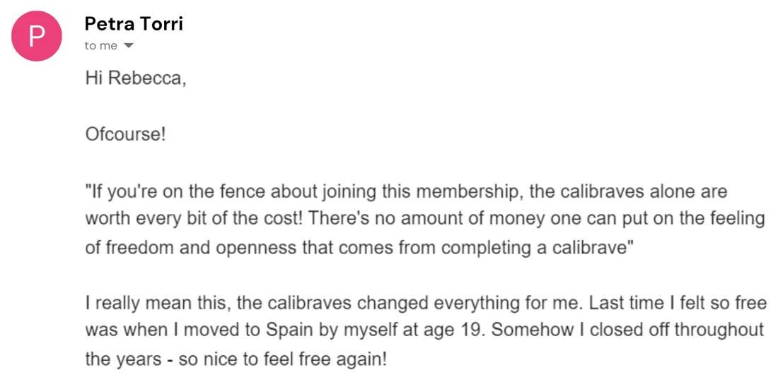 The Calibraves have supported me in one of my biggest blocks that hold me back, which is being a burden to others and in actually reaching out and disrupting someone's day. In my mind, that's what it was. Understanding that you're really not bothering anyone and most people are happy to help or happy to hear what you have to say. And it was the fear in my own mind of like, oh, I don't want to bother anyone. Once you get through that, it kind of helped me remove that block. So it was a huge support in that way.