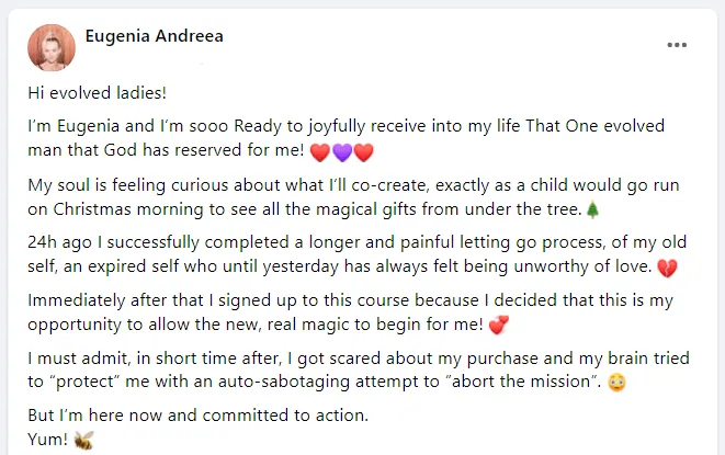 The course for setting an unshakeable foundation to attract and meeting your dream man! The steps I share inside this course are what I, and countless of my students have used, to attract wonderful loving relationships. :)