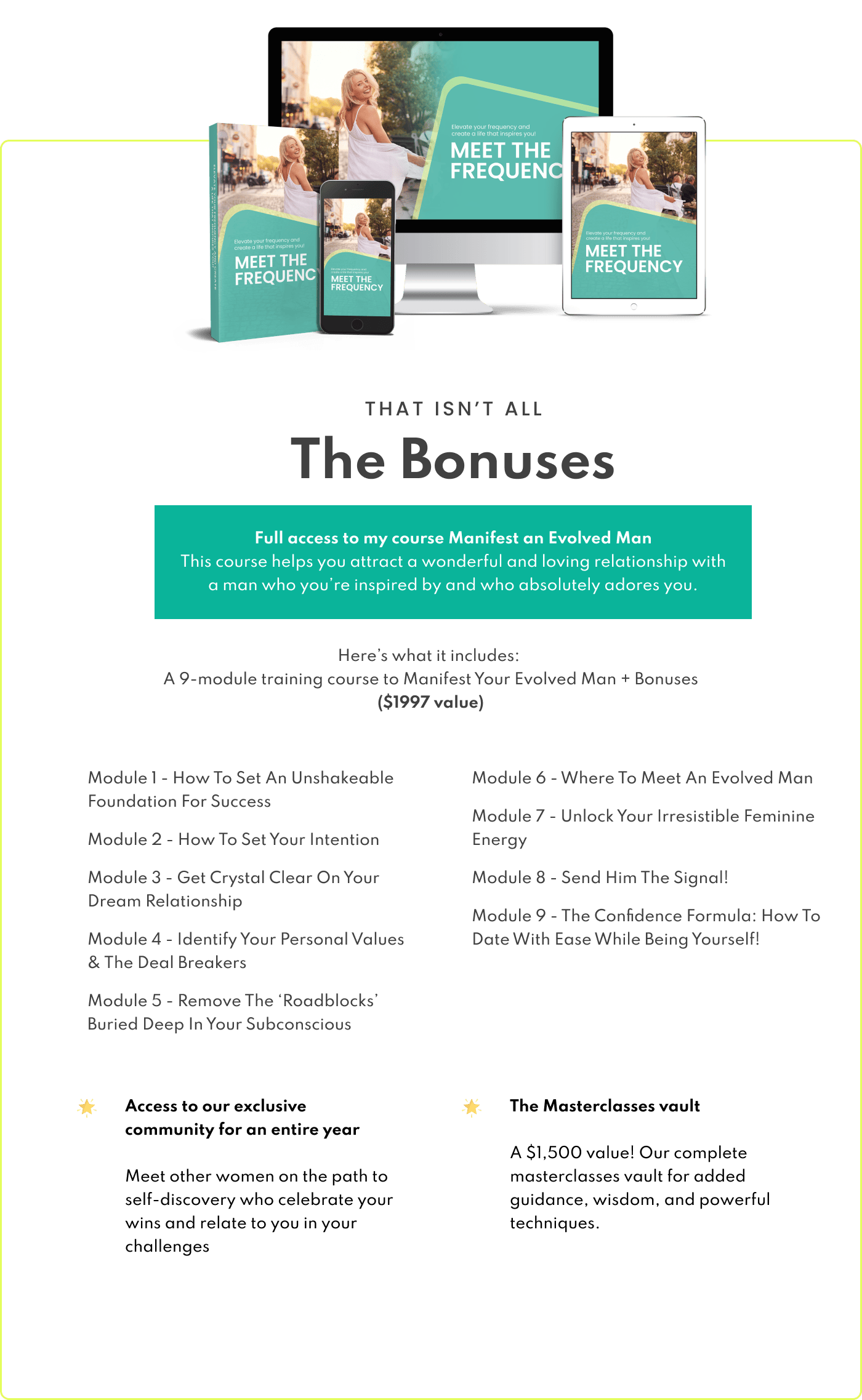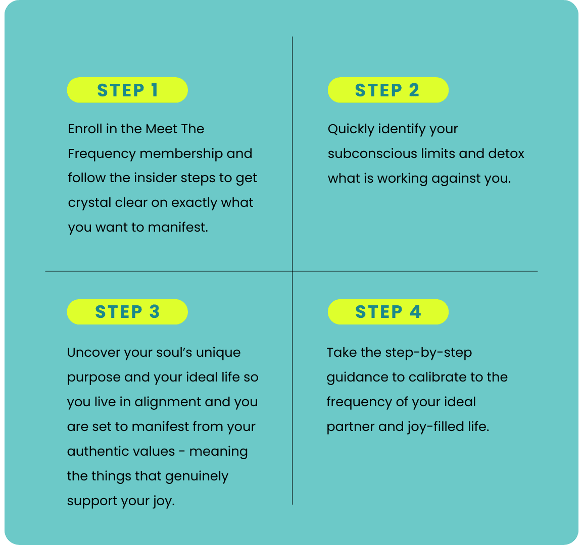 These are the embodied practices that will get you living a more vibrant and fulfilled life in just a couple of weeks. (The practices shift your frequency that quickly!) And we'll work together to maintain that frequency.